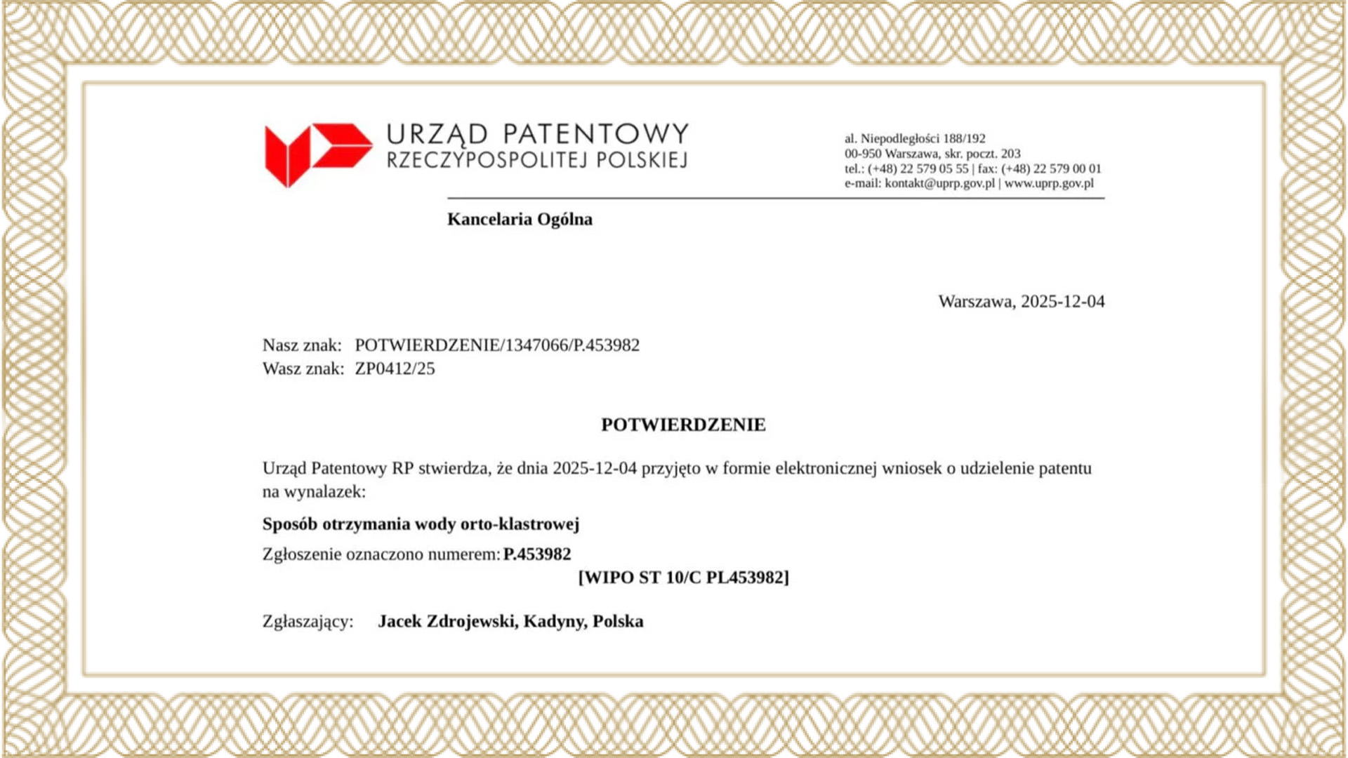 - 4 grudnia 2025 r. Urząd Patentowy Rzeczypospolitej Polskiej przyjął wniosek Living Water Technology o udzielenie patentu na „Sposób otrzymywania wody orto-klastrowej” (zgłoszenie nr P.453982).