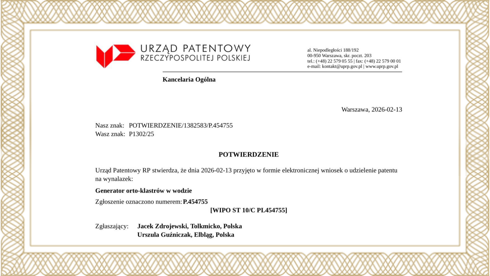 - 13 lutego 2026 r. Urząd Patentowy RP przyjął zgłoszenie Living Water Technology dotyczące wynalazku „Generator orto-klastrów w wodzie” (zgłoszenie nr P.454755).