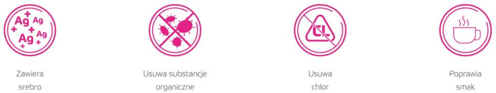 Dzięki granulowanemu węglowi aktywnemu, impregnowanemu srebrem, usuwa z wody chlor oraz szkodliwe substancje organiczne.